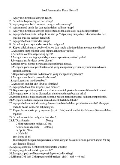 Soal pilihan ganda dan essay. Tips mengerjakan latihan soal : Soal farmasetika dasar kelas b. Soal farmasetika dasar beserta jawaban. Laporan praktikum farmasetika pulveres dan pulvis. Pembahasan soal ukai part 10 akan membahas 5 soal pilihan terkait farmasetika dan hitungan hlbnantikan pembahasan soal ukai selanjutnya . Written by admin wednesday, august 28, 2019 add comment edit. Berikut adalah latihan soal dasar dasar kefarmasian kelas sepuluh semester gasal/ganjil untuk smk farmasi. Apa unsur dasar manajemen mutu ? Soal latihan farmasi dasar, farmasetika, manajemen farmasi, ilmu resep/ preskripsi. Apa yang membedakan resep dengan . Apa yang dimaksud dengan resep? Simulasi soal · praktek mandiri perawat · keperawatan gadar &